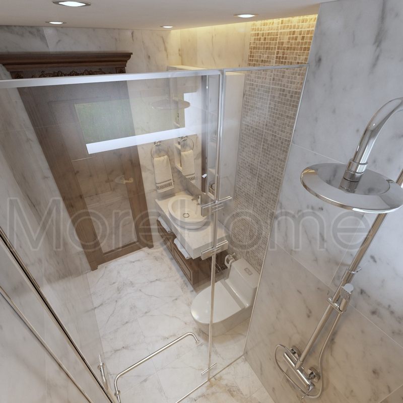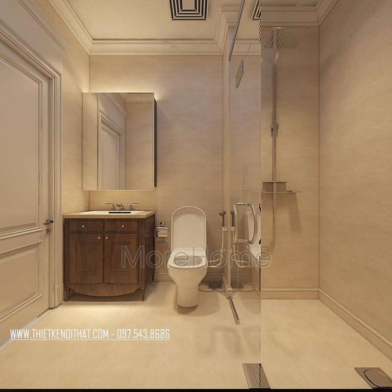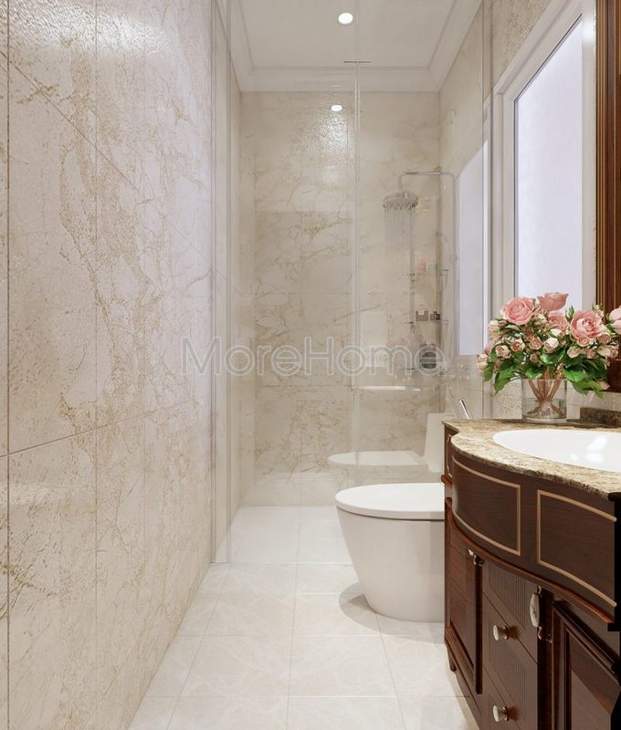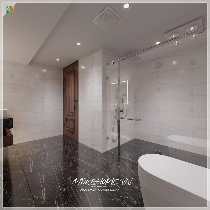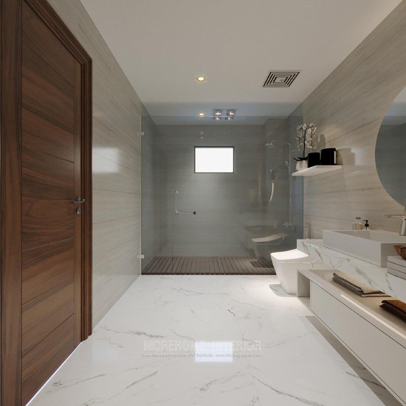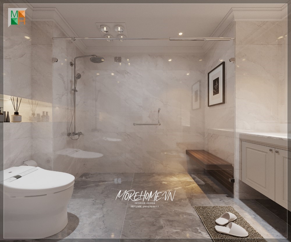 Vách tắm kính 180 độ ngăn giữa khu vực phòng tắm đứng và nhà vệ sinh giảm thiểu sự ướt át của phòng tắm gây ra mang lại sự thoải mái nhất cho gia chủ khi sử dụng phòng.