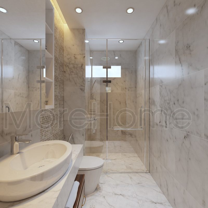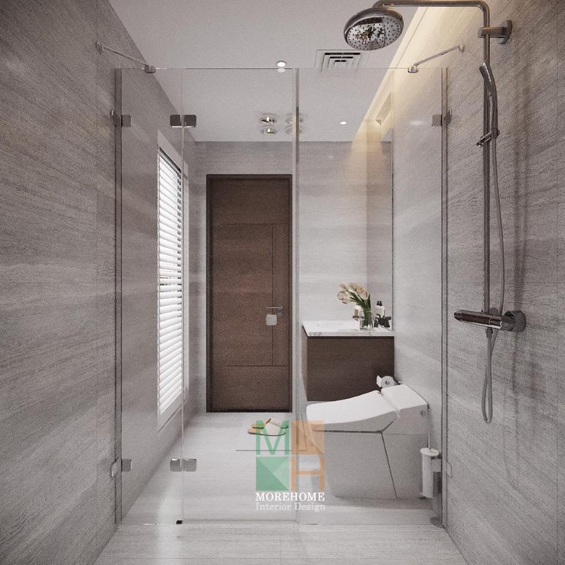 Vách tắm kính 180 độ cho phòng tắm nhỏ với nội thất tối giản nhưng cao cấp, hiện đại cho chung cư, nhà phố
