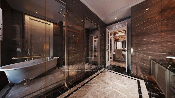 Vách tắm kính 180 độ ngăn cách giữa không gian mà không bị trật hẹp khó chịu.
