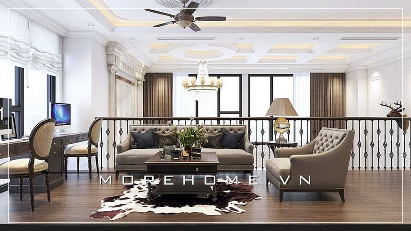 Mẫu thiết kế nội thất cho phòng khách ở tầng 2 của biệt thự được thiết kế với kích thước nhỏ gọn và bộ sofa cao cấp để tạo ra không gian thư giãn và đón khách đầy lí tưởng.